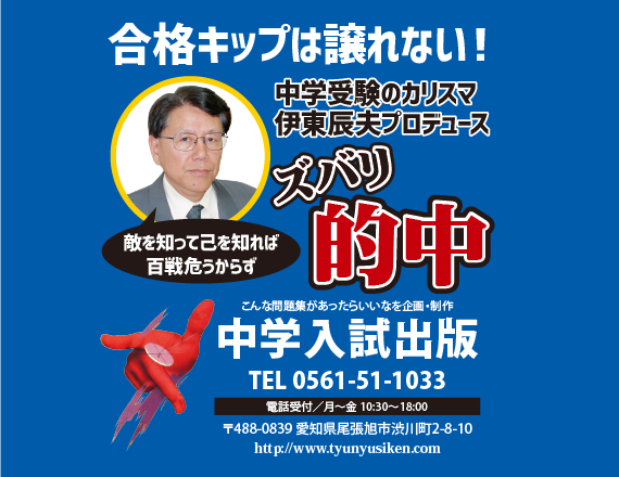 お陰様で、当会販売の「入試予想問題」「志望校模試」「合格福袋」等から毎年、的中問題、類似問題が多数出題されてきました。このように当会の入試問題分析力は定評のあるもので、その分析力は入試教材作りに生かされております。また、各地域の会員塾の指導はその基礎の上に成り立っております。新年度の受験指導ご希望の折は信頼ある会員塾にお問い合わせください。